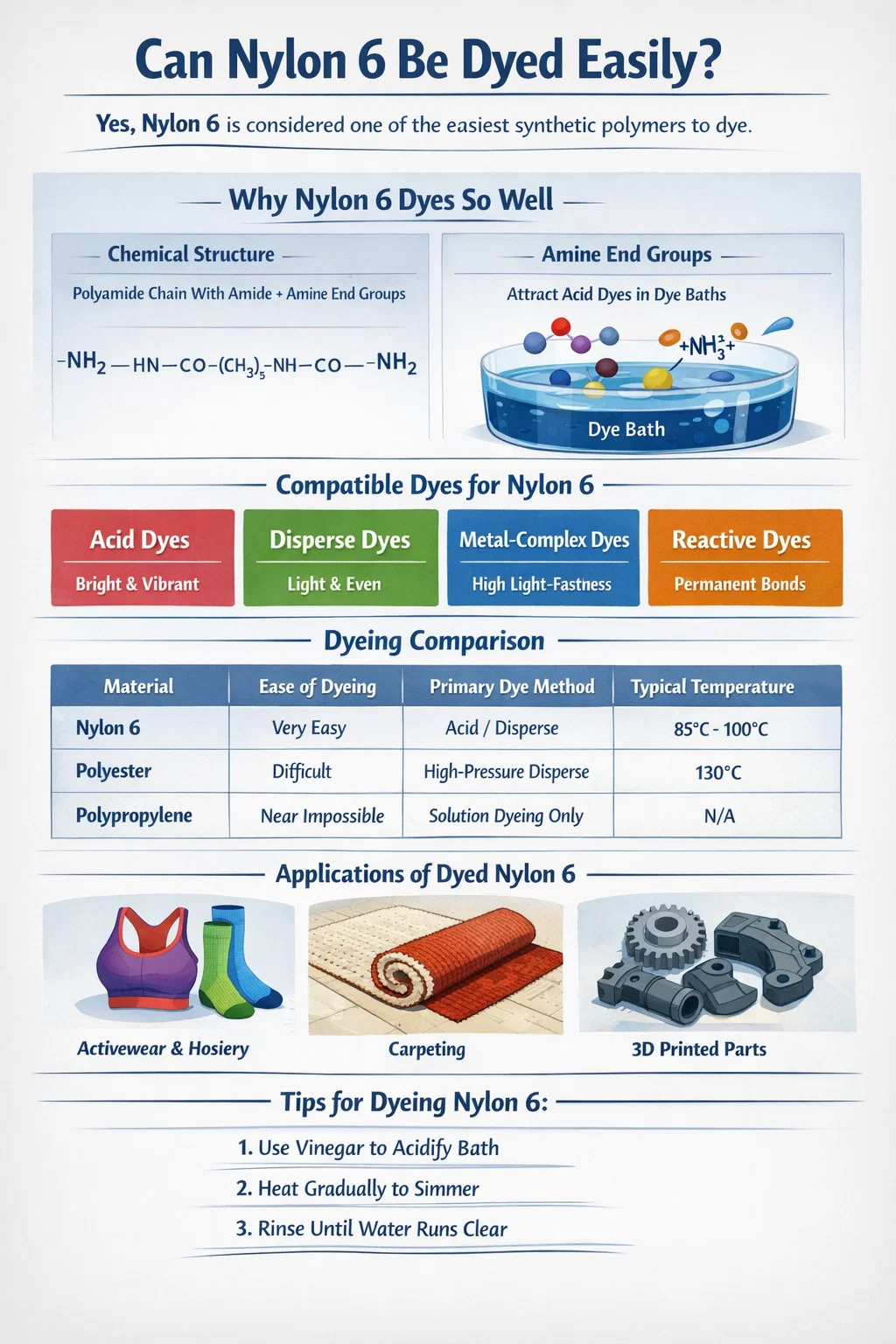 Ja, Nylon 6 anses vara en av de enklaste syntetiska polymererna att färga , speciellt jämfört med andra plaster som polyester eller polypropen. Dess unika kemiska struktur innehåller många reaktiva platser som tillåter färgämnesmolekyler att bilda starka, permanenta bindningar. Denna höga affinitet för färgämnen gör att Nylon 6 kan uppnå levande, djupa nyanser och utmärkt färgbeständighet med användning av vanliga vattenhaltiga färgningsprocesser vid relativt låga temperaturer.