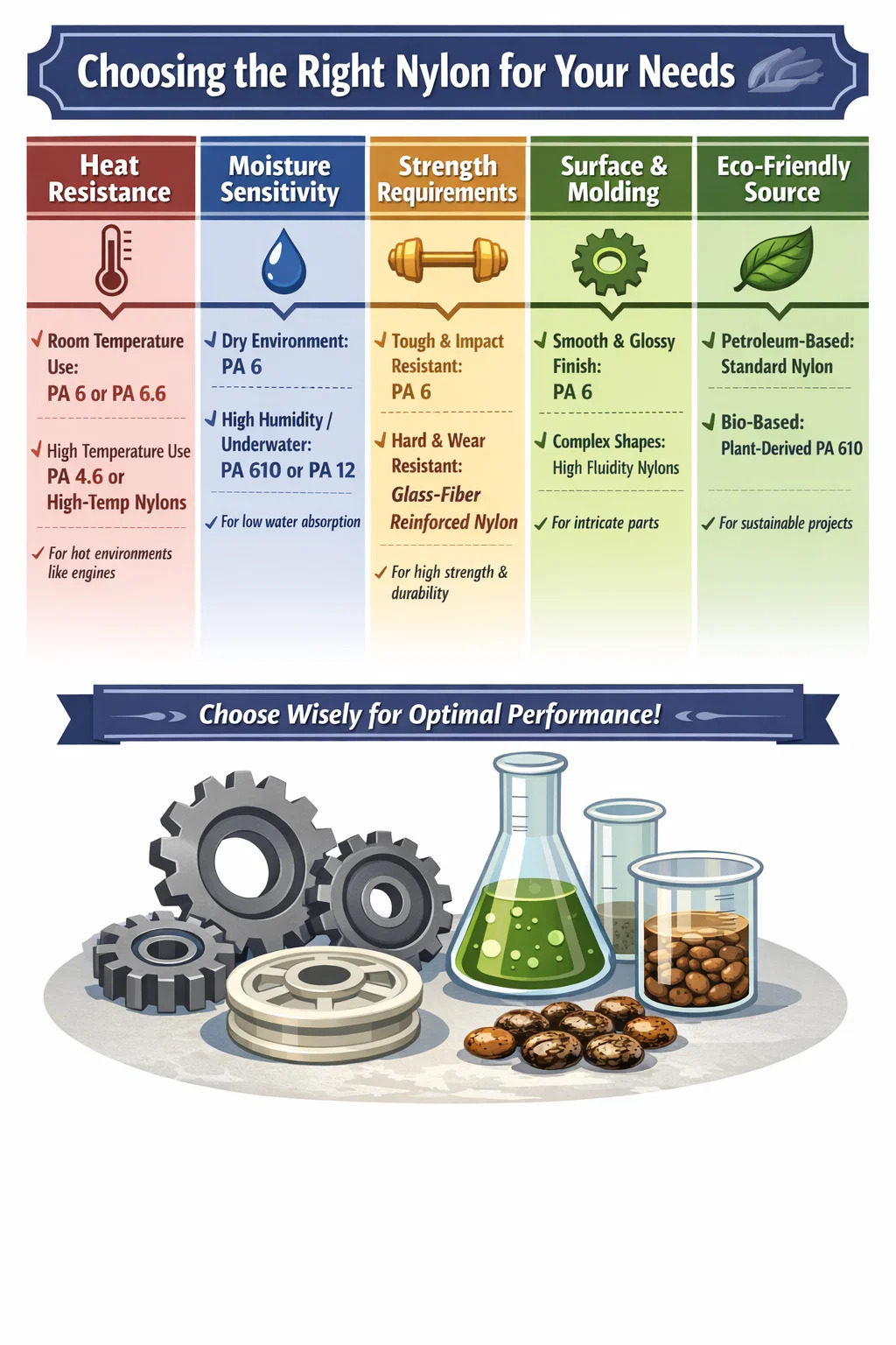 Allmänt hushålls- eller vanlig industriell användning: Om delen endast fungerar i rumstemperatur eller i en mild miljö, den klassiska Polyamid 6 eller PA 6.6 räcker. De är kostnadseffektiva och klarar de flesta vardagliga situationer.