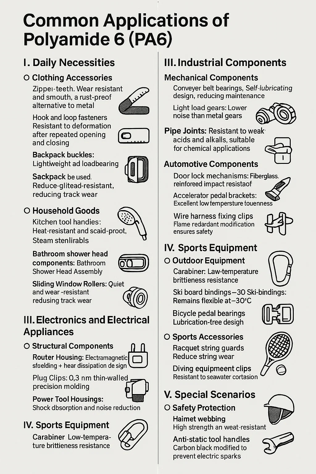 Följande är en introduktion till vanliga tillämpningar av polyamid 6 (PA6):