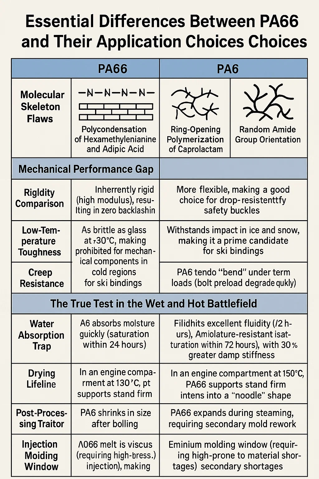Lågtemperaturens seghet: PA66 är lika spröd som glas vid -30 ° C, vilket gör det förbjudet för mekaniska komponenter i kalla regioner; PA6 tål inverkan även i is och snö, vilket gör det till en främsta kandidat för skidbindningar.